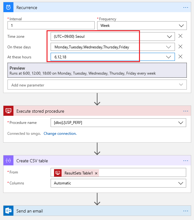 위 캡쳐는 매주 평일 6, 12, 18시 하루 3회 Azure SQL DB 의 usp_perf 프로시저를 실행하고 그 결과를 Outlook 커넥터를 통해 이메일로 전달하는 로직을 구현한 캡쳐의 일부입니다. 자세한 사항은 아래 참고자료가 도움이 될 것입니다.