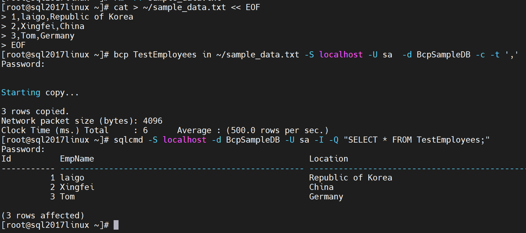 # bcp TestEmployees in ~/sample_data.txt -S localhost -U sa -d BcpSampleDB -c -t ','