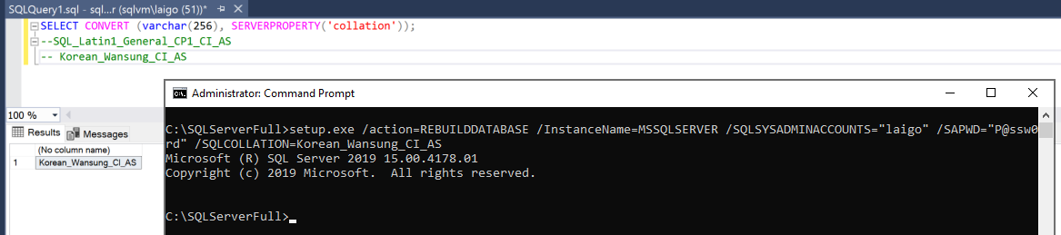 C:\SQLServerFull> setup.exe /action=REBUILDDATABASE /InstanceName=MSSQLSERVER /SQLSYSADMINACCOUNTS="laigo" /SAPWD="P@ssw0rd" /SQLCOLLATION=Korean_Wansung_CI_AS