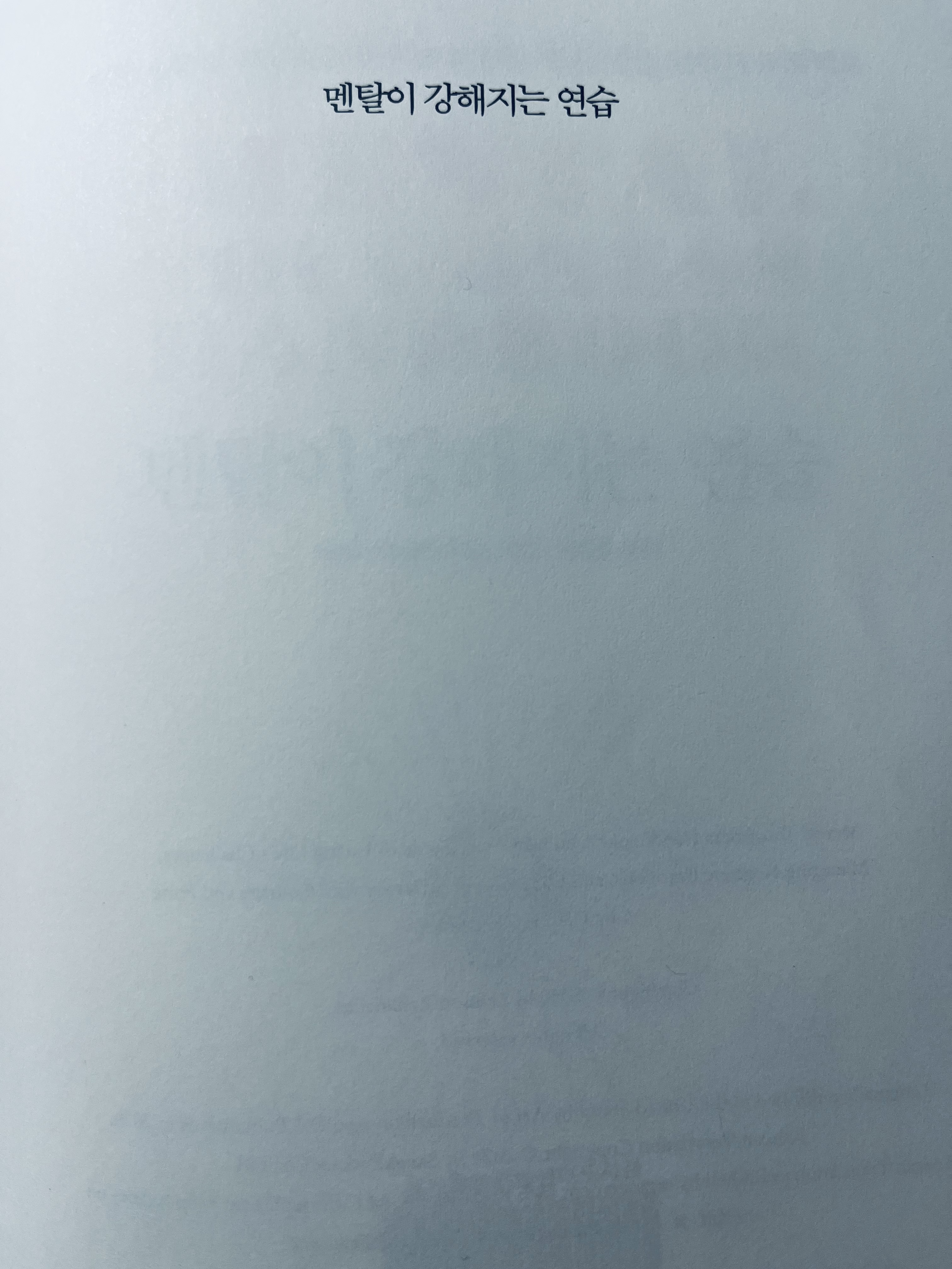 그 다음은 현실을 부정하거나 현재 상황에 휘말리지 않고 내가 앞으로 해야 할 일이 집중하는 것이 더욱 중요합니다. 그런면에서 평소 긍정적인 사고를 가진 사람이 멘탈이 강할 확률이 높을 수 밖에 없을 것 같고 어려운 상황에 놓였을 때, 좌절보다는 개선의 기회로 인지하는 것이 좋은데 이건 가장 어려운 단계라고 생각합니다. 하지만 이 어려운 것을 이겨내고 고생해서 어려움을 극복한 나에게 칭찬하고 보상하는 것을 놓치지 않음으로써 나의 멘탈력과 근성을 키워나갈 수 있습니다. 방법은 알겠는데 그 과정과 연습이 쉽지 않겠죠? 더 궁금하시면 책을 한 번 읽어보시기를!