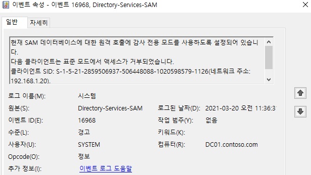 이렇게 차단되는 원인이 해당 그룹 정책에 의해서 발생하는 것이 맞는지 검증이 필요하다면 RestrictRemoteSamAuditOnlyMode 레지스트리를 만들어서 1을 설정하면 그 즉시 적용되며 설정된 그룹 정책을 무시하고 모든 사용자의 설정된 SAMRPC 접근이 모두 허용됩니다. 다만 그룹 정책에 의해 접근이 허용하지 않는 사용자가 SAMRPC 접근을 요청한 경우 아래와 같이 시스템 이벤트 로그에 Event ID 16968 경고를 발생하지만 실제 접근은 차단하지 않기 때문에 운영 환경에 이 정책을 적용하기 앞서 어플리케이션 테스트를 할 때 유용하게 사용할 수 있습니다.