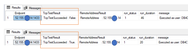 먼저 아래 스크립트 상단에 있는 @endpoint, @port 정보에 대해서만 연결 대상 정보로 변경합니다. 그리고 SQL MI 에 연결한 후 새쿼리를 통해 이 스크립트를 수행하면 TCP 연결 테스트 결과를 반환하게 됩니다.